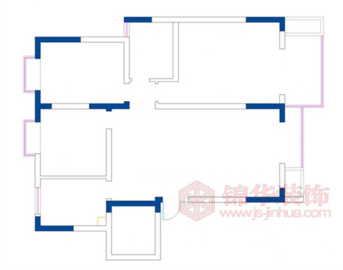 此戶型是典型的3室2廳1衛的房型,所有房間都有窗,有較好的采光通風性能。但此戶型餐廳和客廳區隔不明顯,而衛生間必須獨立出來,造成餐廳和衛生間門相對是比較大的缺憾之一。此外,兩個小房間之間的墻是承重墻,無法變動。小房間近于正方形,難以合理安排,廚房空間有限等等都是需要設計師在空間功能設計上需要重點考慮的地方。